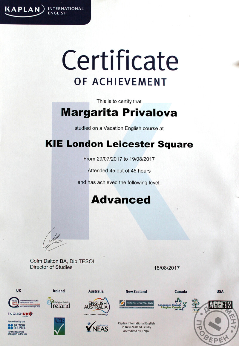 - Проходила курс обучения в Лондоне с присвоением уровня advanced (сертификат, август 2017 г.).