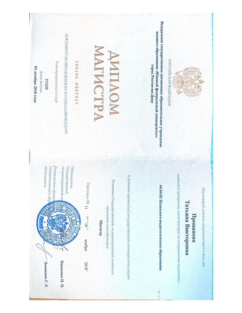 - Южный федеральный университет, направление «Психолого-педагогическое образование», 2016–2018 гг.