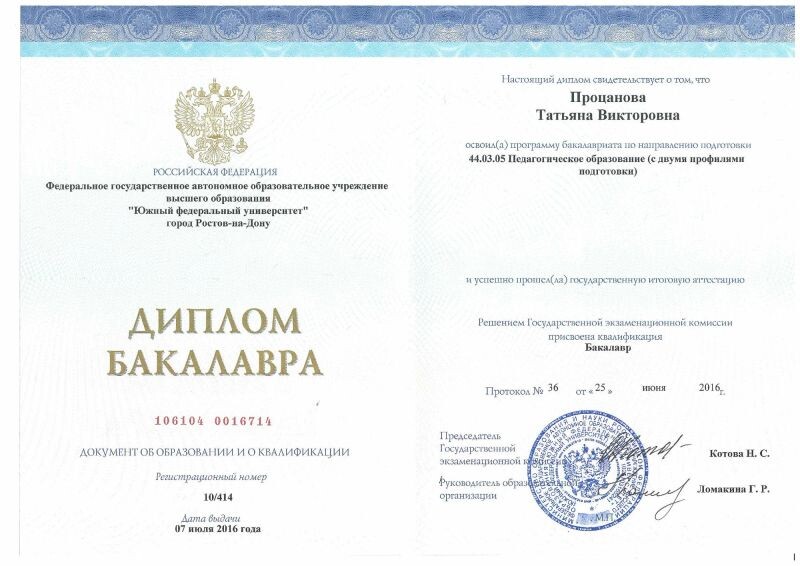 - Южный федеральный университет, педагогическое образование, 2011–2016 гг.