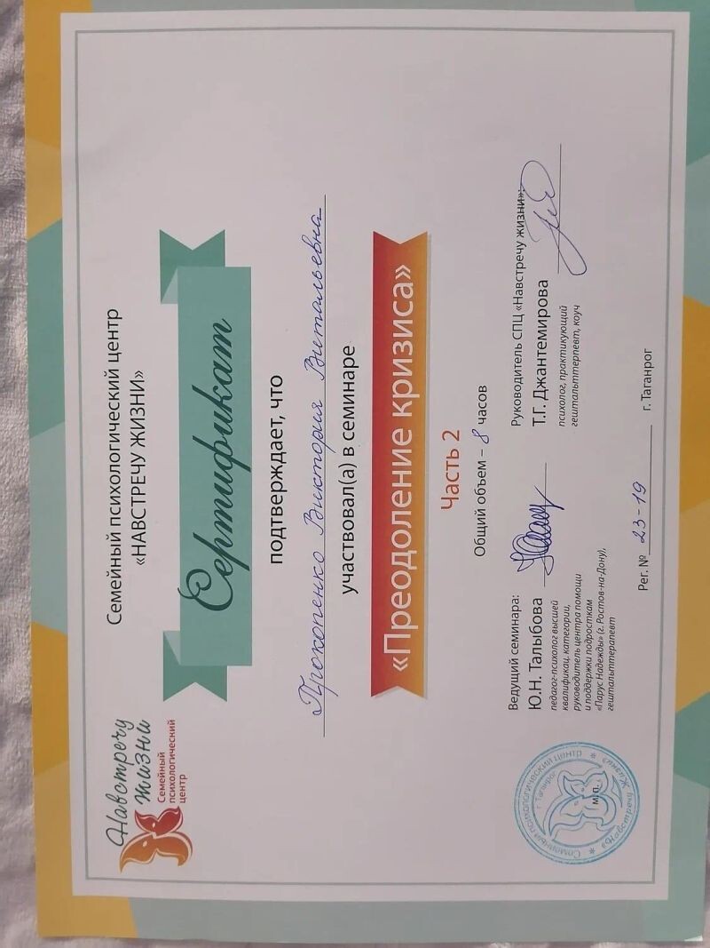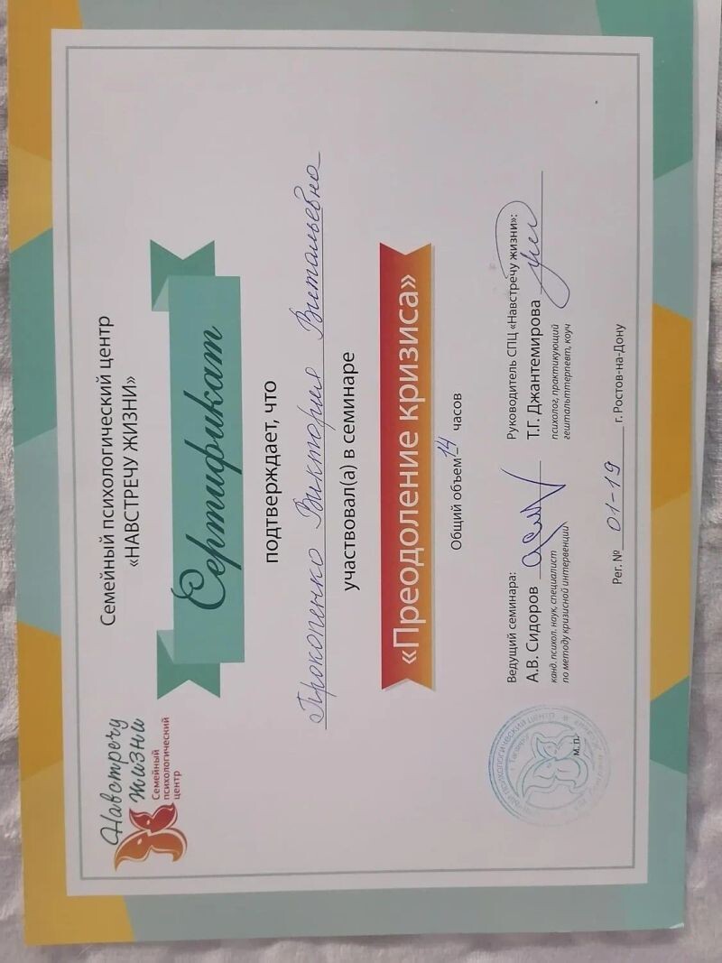 - СПЦ «Навстречу жизни», семинар по работе с кризисом, 2019 г.