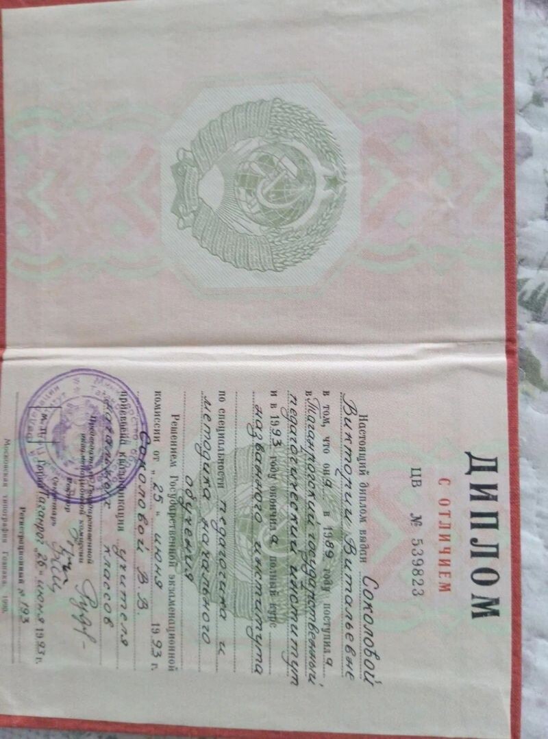 - Таганрогский государственный педагогический институт, специальность – педагогика и методика начального обучения, квалификация – учитель начальных классов, 1989–1993 гг.