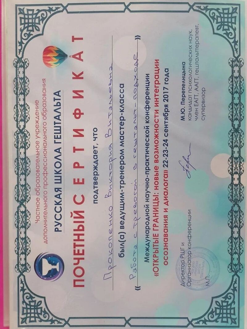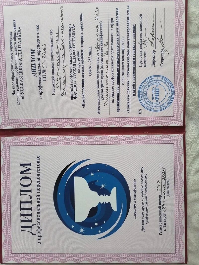 - Русская школа гештальта, гештальт-практик: психологическое консультирование семьи и детей с применением гештальт-подхода (252 часа), 2020–2021 гг.