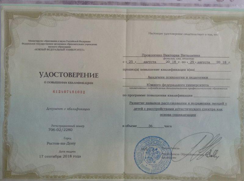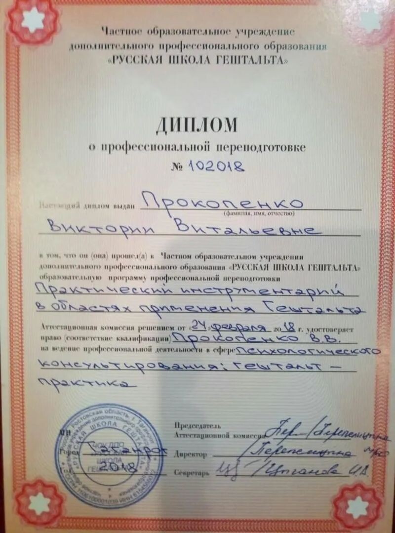 - Русская школа гештальта (г. Таганрог), проф. переподготовка по программе «Практический инструментарий в областях применения гештальта», квалификация на ведение профессиональной деятельности в сфере психологического консультирования (гештальт-практика), 2018 г.