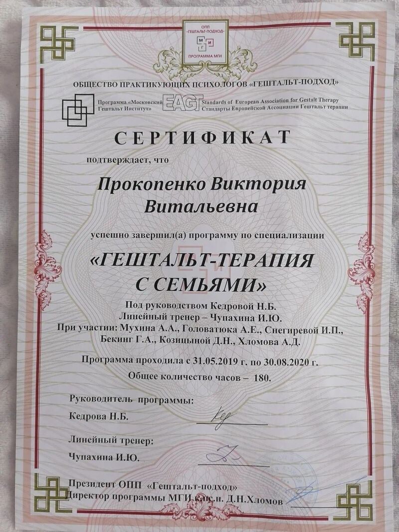 - ОПП «Гештальт-подход», программа «Гештальт-терапия с семьями» (180 ч), 2019–2020 гг.