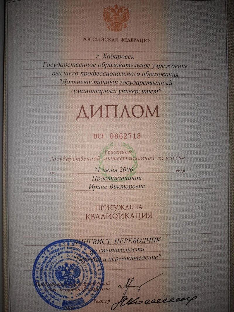 - ГОУ ВПО «Дальневосточный государственный гуманитарный университет», лингвист, переводчик по специальности «перевод и переводоведение», 2001–2006 гг.