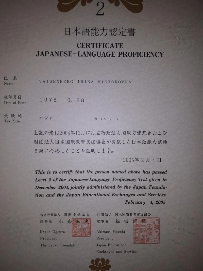 - Сертификат JLPT (Нихонго Норёку Сикен), 2 уровень, 2005 г.