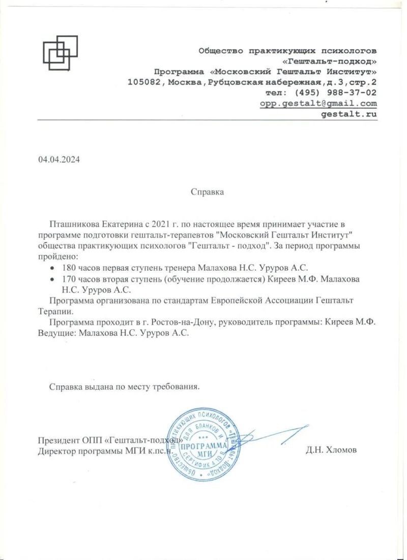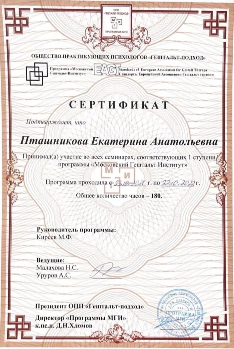 - ОПП «Гештальт-подход», 1 ступени программы «Московский Гештальт Институт», 2021–2022 гг.