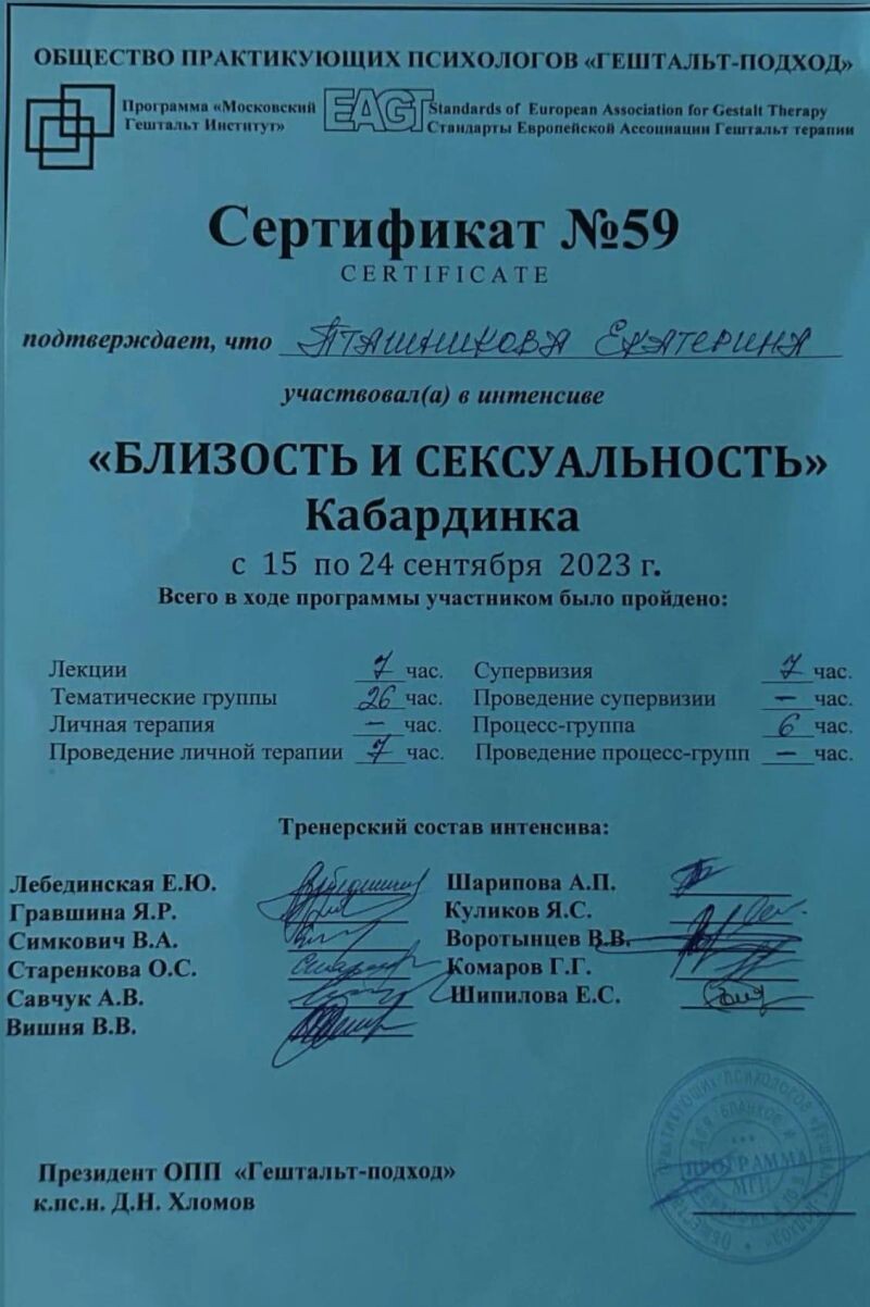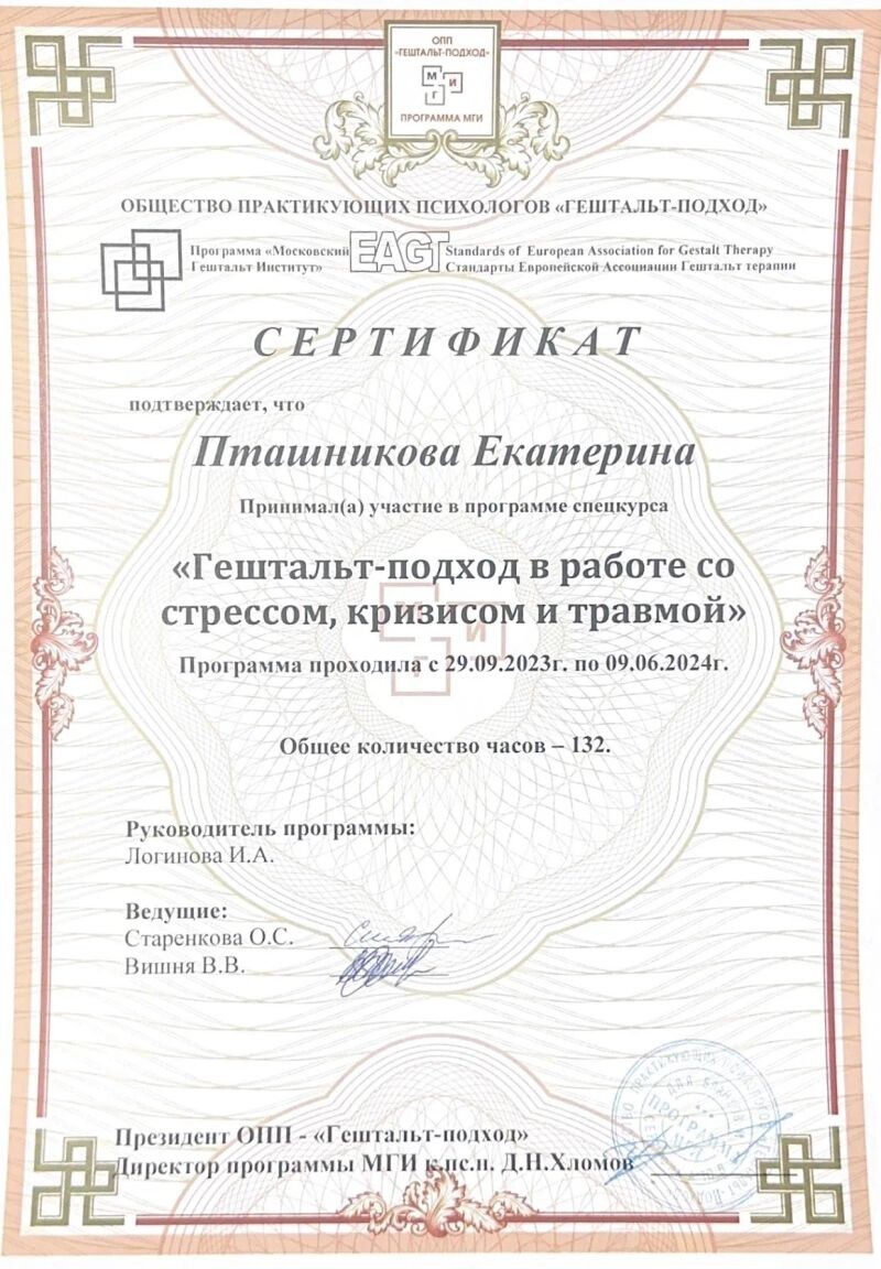 - Общество практикующих психологов «Гештальт-подход», сертификат о прохождении курса «Гештальт-подход в работе со стрессом, кризисом и травмой», 2023–2024 гг.