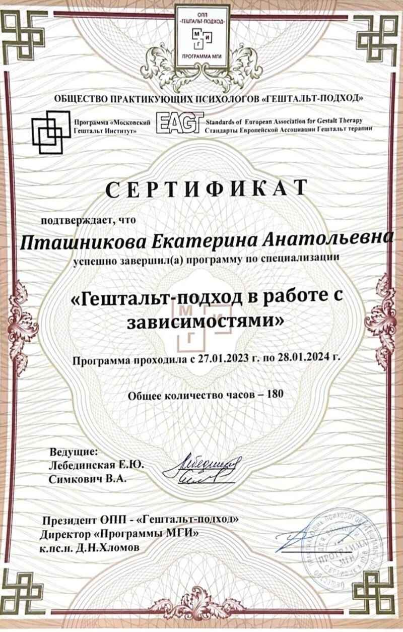 - ОПП «Гештальт-подход», МГИ, программа специализации «Гештальт-подход в работе с зависимостями», 2023–2024 гг.