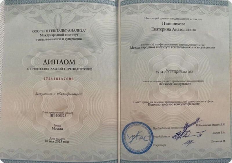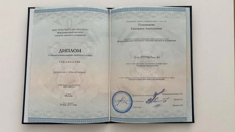 - Международный институт гештальт анализа и супервизии , Психологконсультант, 2022–2023 гг.