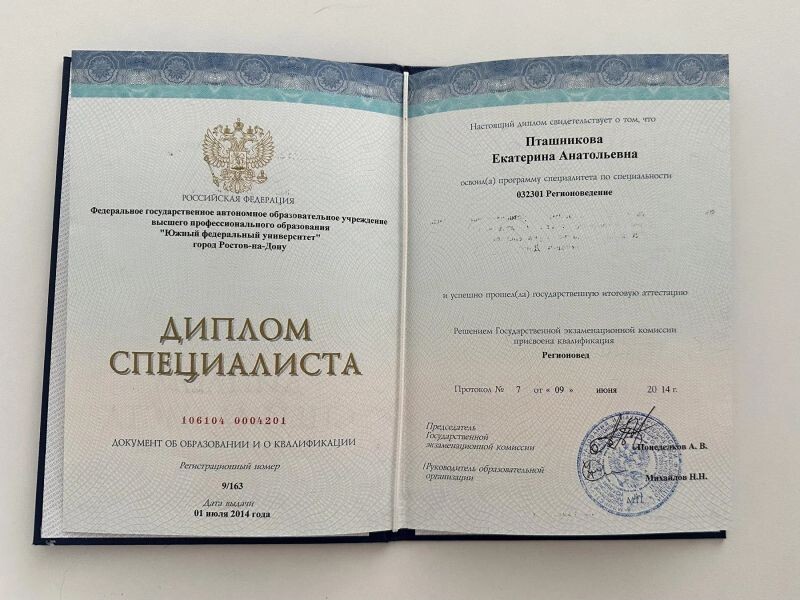 - Южный Федеральный Университет , Регионовед, 2009–2014 гг.