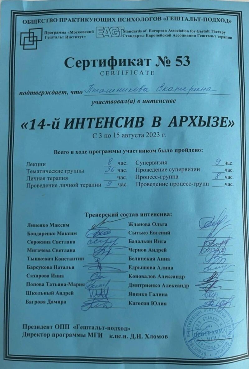 - Общество практикующих психологов «Гештальт-подход», интенсив «14-й Интенсив в Архызе», 2023 г.