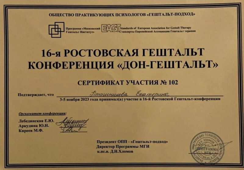 - Общество практикующих психологов «Гештальт-подход», участник 16-ой Ростовской гештальт конференция «ДОН-ГЕШТАЛЬТ»,, 2023 г.