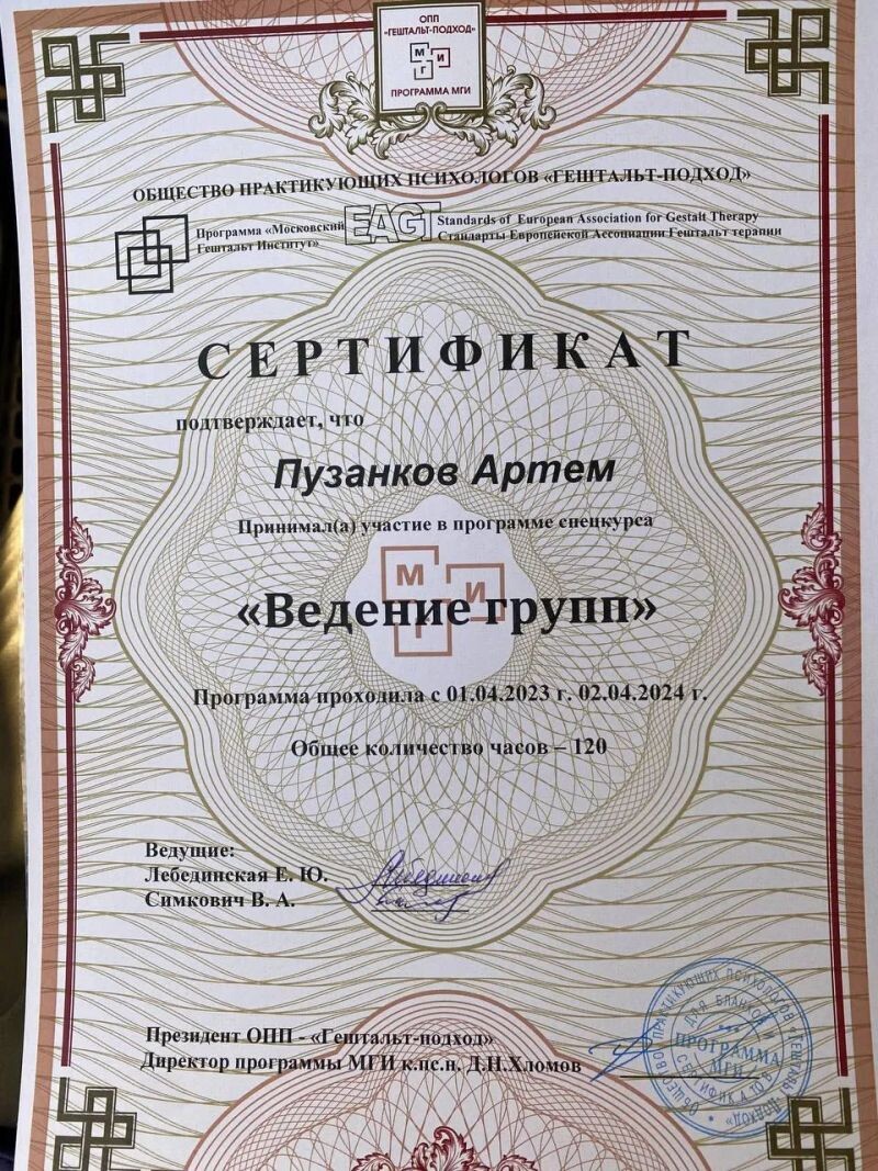 - ОПП «Гештальт-подход», МГИ, программа «Ведение групп», 2023–2024 гг.