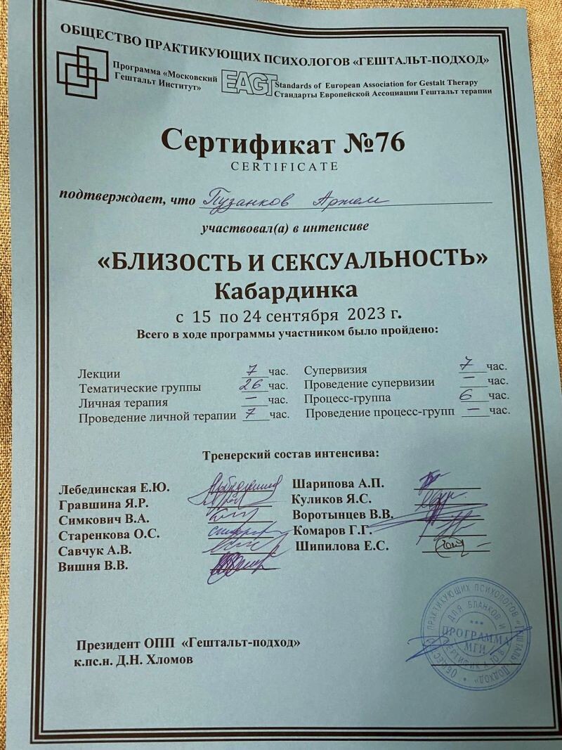 - ОПП «Гештальт-подход», МГИ, интенсив «Близость и сексуальность», 2023 г.