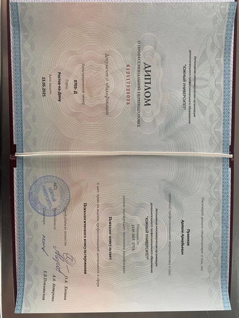 - Южный университет, психолог-консультант, 2024–2025 гг.