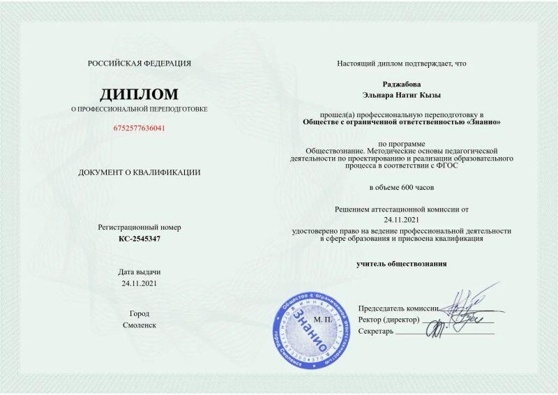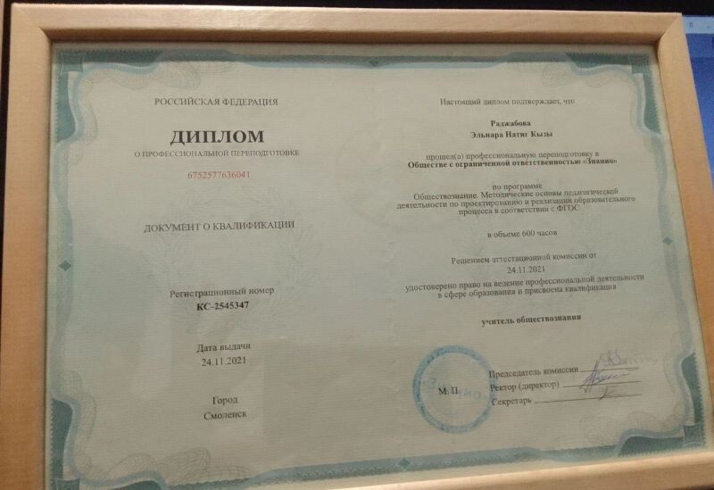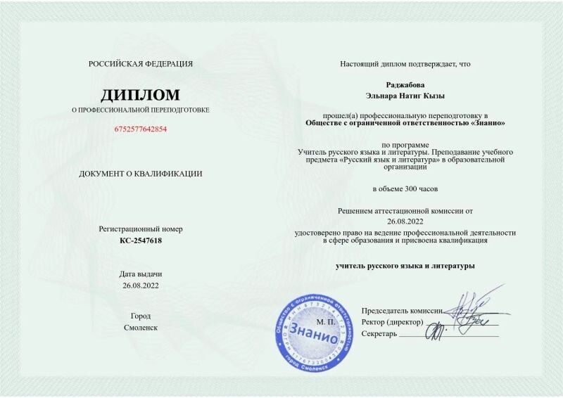 - ООО «Знанио», профессиональная переподготовка по программе «Учитель русского языка и литературы», 2021–2022 гг.