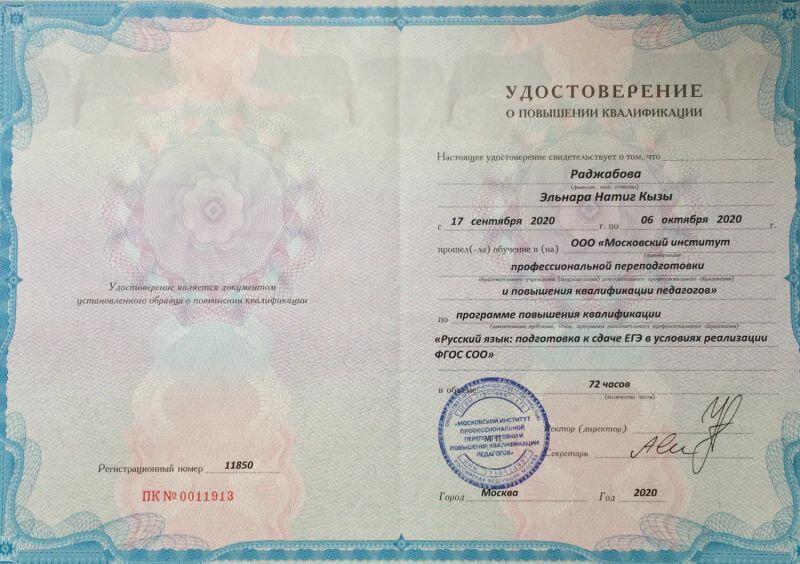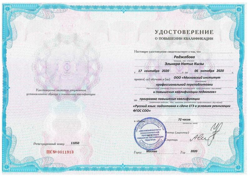 - Московский институт профессиональной переподготовки и повышения квалификации педагогов, русский язык: подготовка к сдаче ЕГЭ в условиях реализации ФГОС СОО, 2020 г.