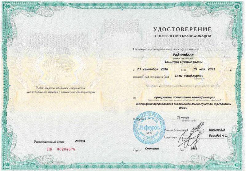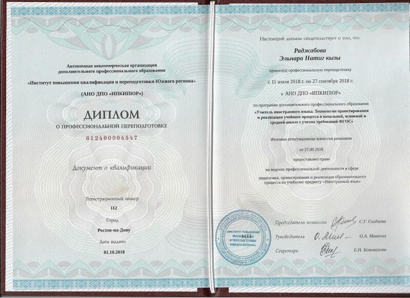 - Институт повышения квалификации и переподготовки Южного региона, профессиональная переподготовка «Учитель иностранного языка. Технология проектирования и реализации учебного процесса в начальной, основной и средней школе с учетом требований ФГОС», 2017–2018 гг.