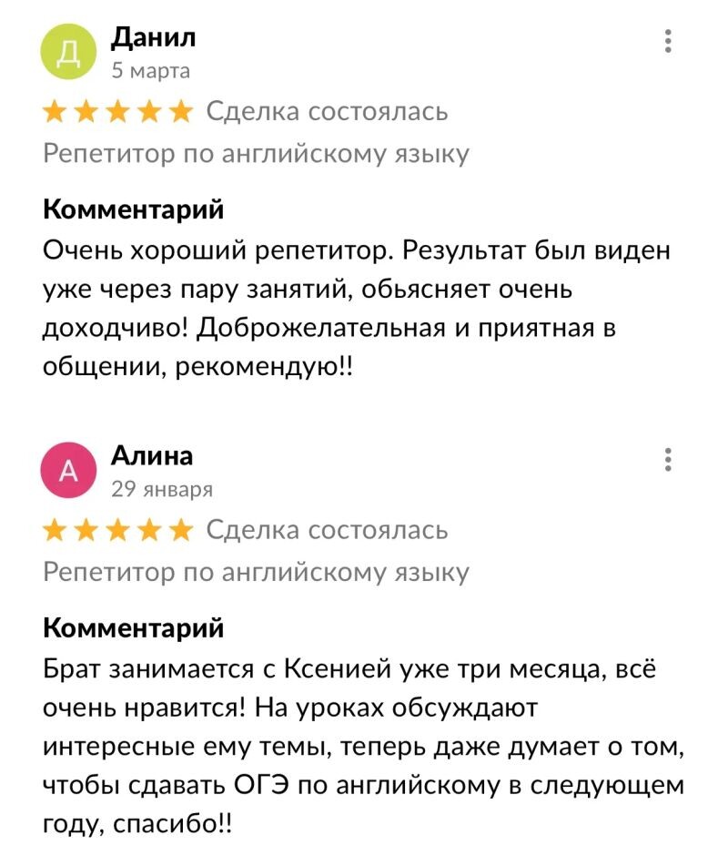 Ксения замечательный преподаватель! Занятия проходят продуктивно и интересно. Занимается сын подросток, ему всё очень нравится, на занятиях позитивный настрой, всегда ждёт следующего занятия. Все темы подробно и понятно разбираются, будем продолжать заниматься!