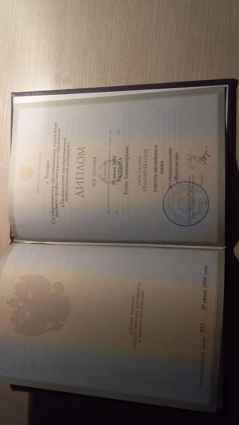 - Таганрогский государственный педагогический институт, факультет иностранных языков, специальность – филолог, учитель английского языка, 2004 г.