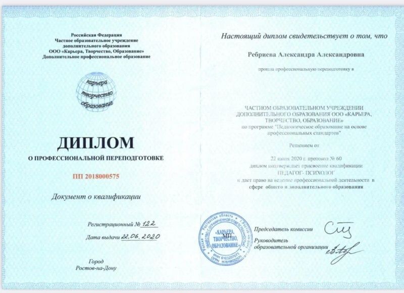 - ООО «Карьера. Творчество. Образование», квалификация «педагог-психолог», 2020 г.