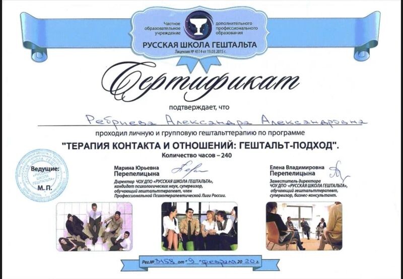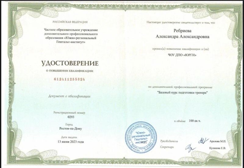 - ЮРГИ, повышение квалификации по программе «Семейное консультирование. Работа с семьёй и супружескими парами в гештальт-подходе», 2024 г.