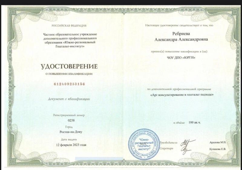 - ЮРГИ, повышение квалификации по программе «Арт-консультирование в гештальт-подходе», 2023 г.