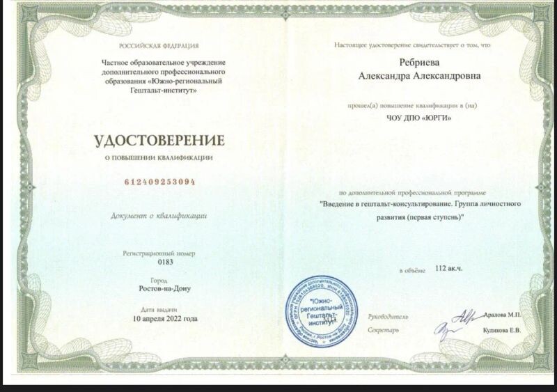 - ЮРГИ, повышение квалификации по программе «Введение в гештальт-консультирование. Группа личностного развития (первая ступень)», 2022 г.