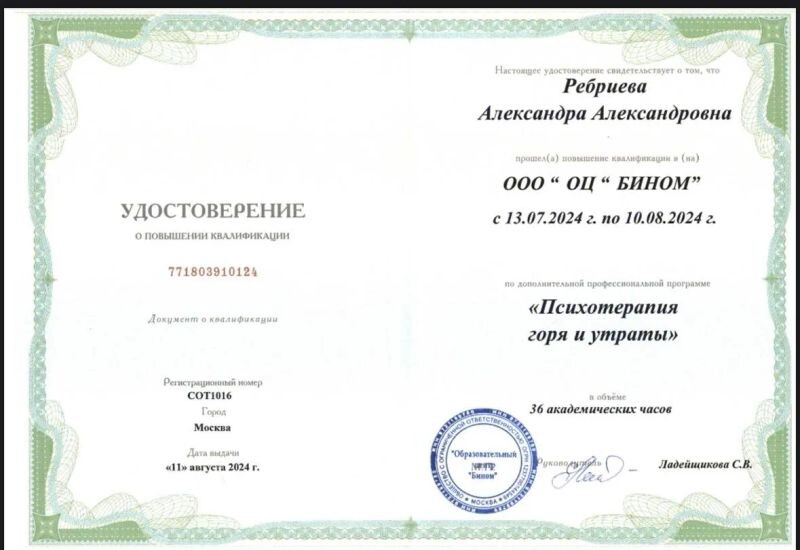 - БИНОМ, повышение квалификации по программе «Психотерапия горя и утраты», 2024 г.