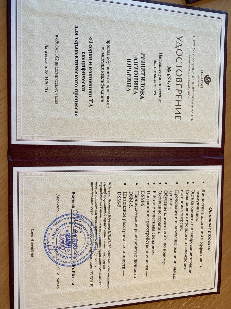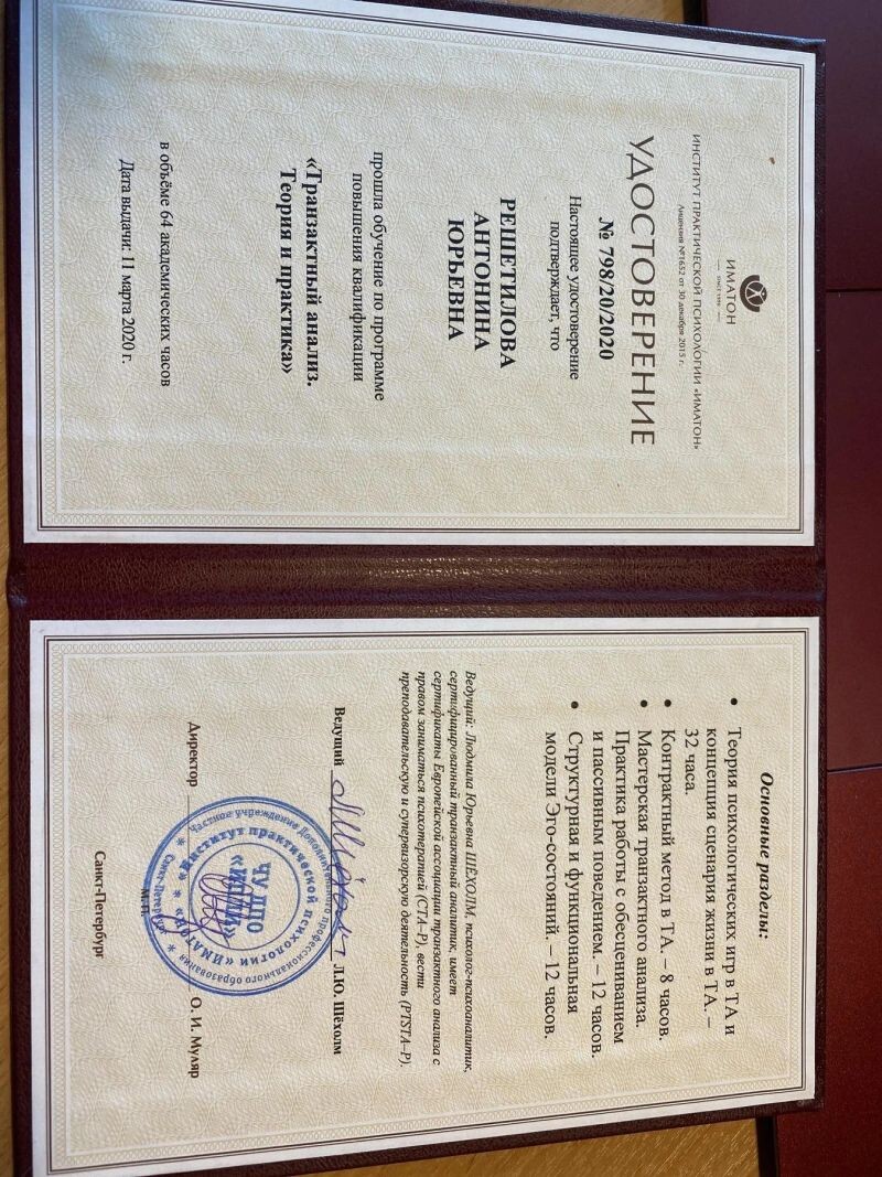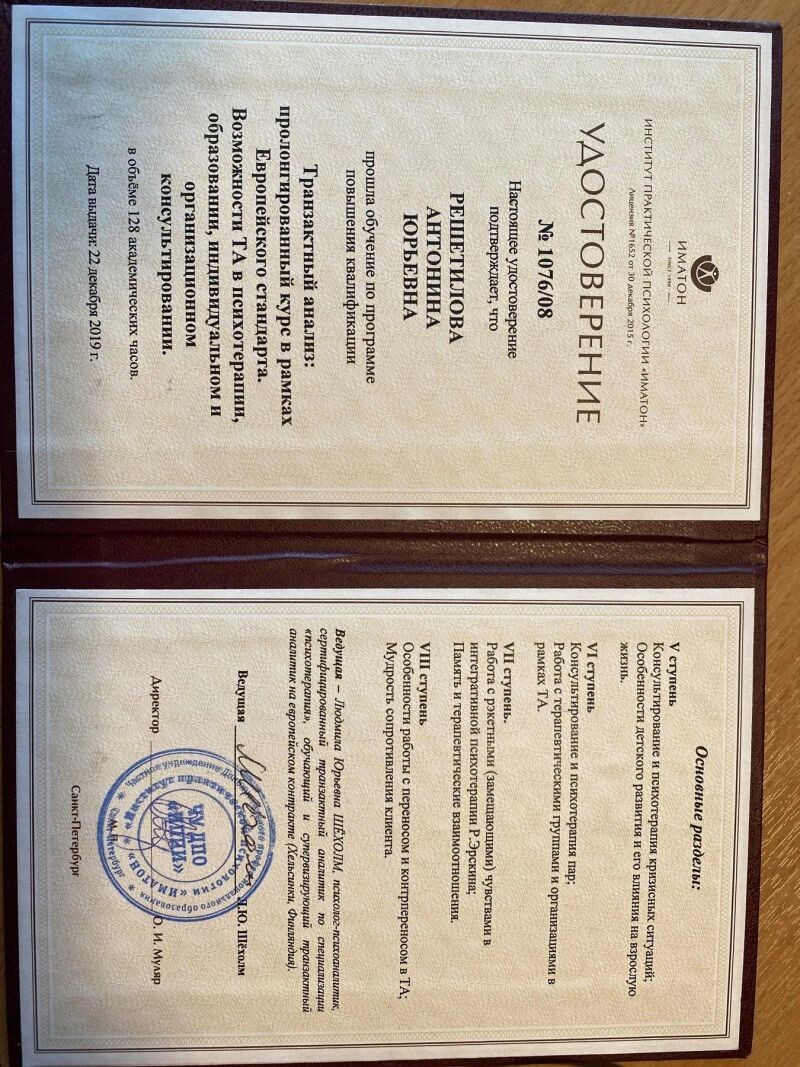- Институт практической психологии «Иматон», повышение квалификации по программе «Теория и концепции ТА специфически для терапевтического процесса», 2019–2020 гг.