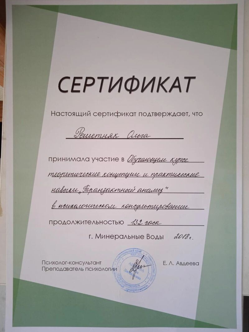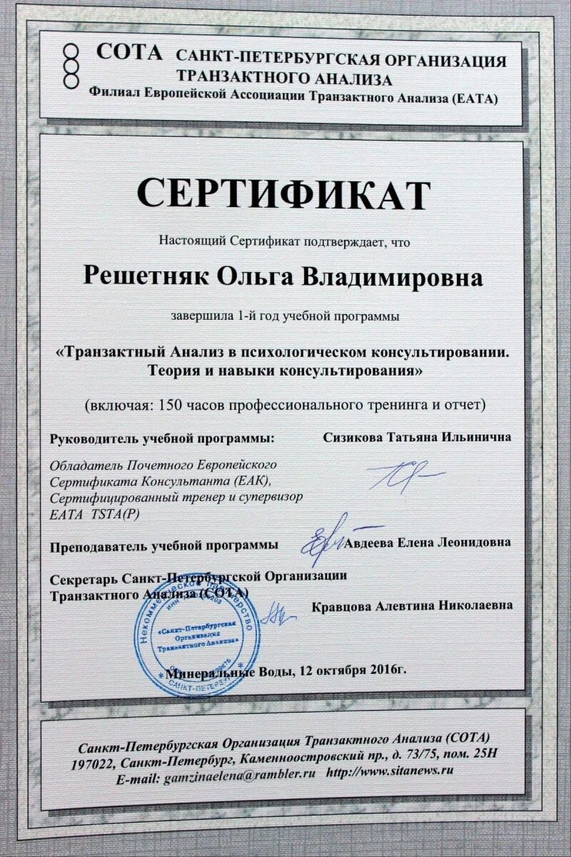 - Санкт-Петербургская организация транзактного анализа, программа «Транзактный анализ в психологическом консультировании. Теория и навыки консультирования», 2015–2016 гг.