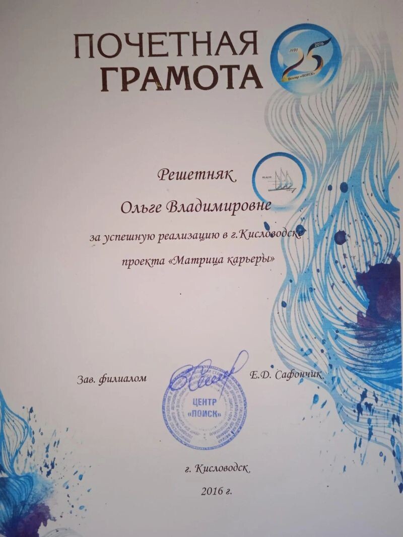 - Центр «Поиск», за успешную реализацию в г. Кисловодск проекта «Матрица карьеры», 2016 г.
