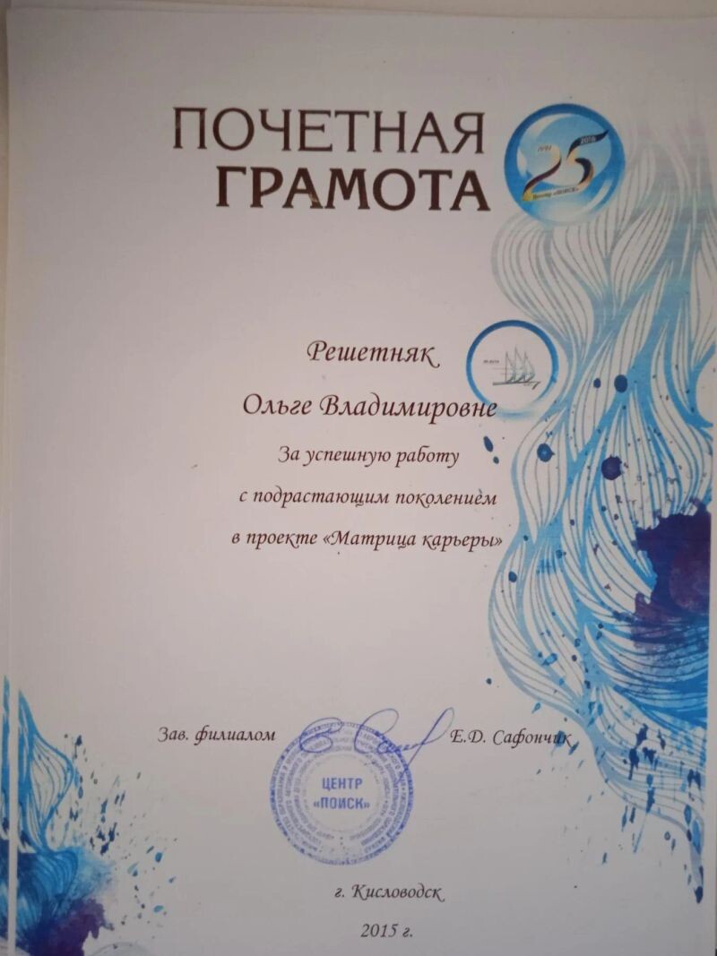 - Центр «Поиск», почётная грамота за успешную работу с подрастающим поколением в проекте «Матрица карьеры», 2015 г.