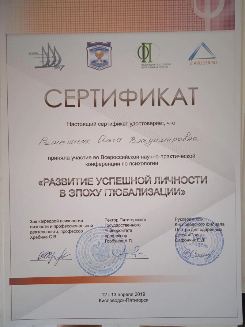 - Всероссийская научно-практическая конференция по психологии «Развитие успешной личности в эпоху глобализации», участник, 2019 г.