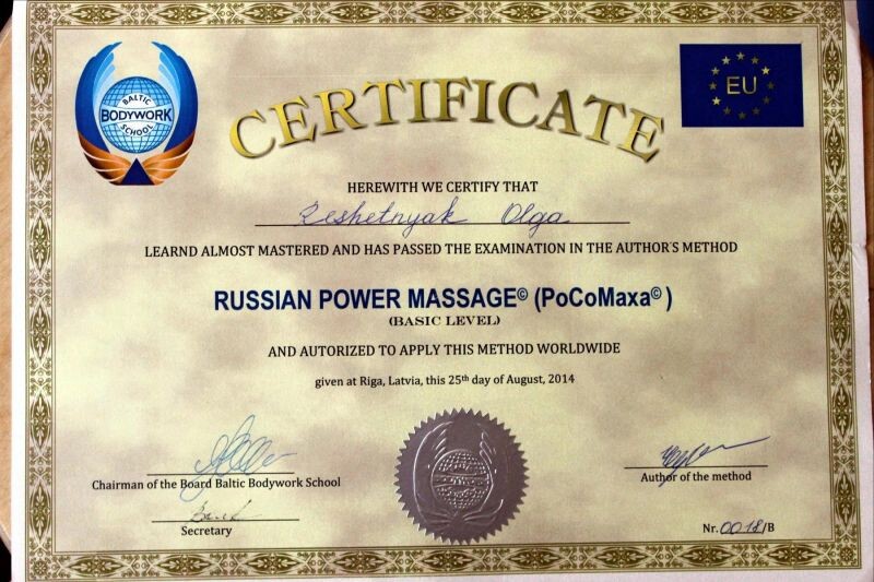 - Baltic Bodywork School, Russian power massage, 2014 г.