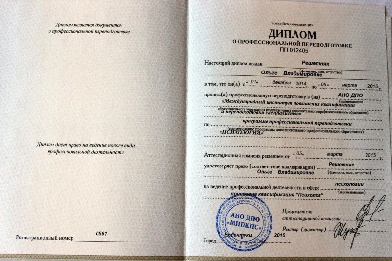 - Международный институт повышения квалификации и переподготовки специалистов, психология., психолог, 2014–2015 гг.