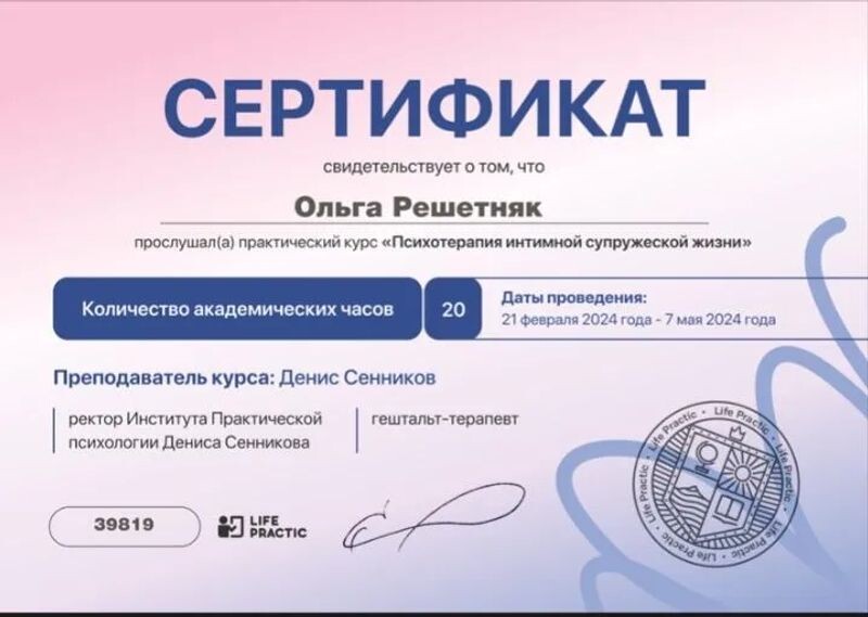- Курс Дениса Сенникова «Психотерапия интимной супружеской жизни», 2024 г.