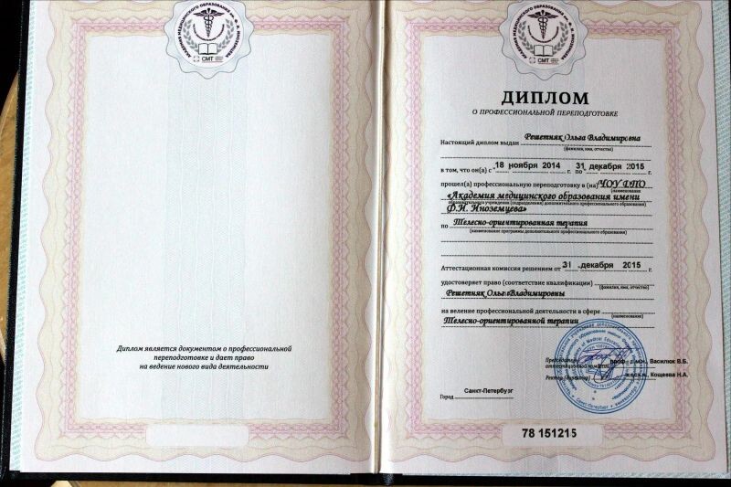 - Академия медицинского образования им. Ф.И. Иноземцева, телесно-ориентированная терапия, 2014–2015 гг.