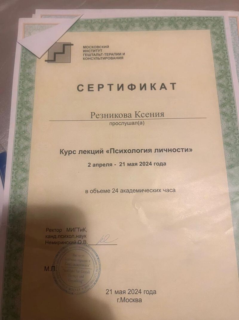 - Центр подготовки волонтёров, благодарность по оказанию психологического консультирования, 2024 г.