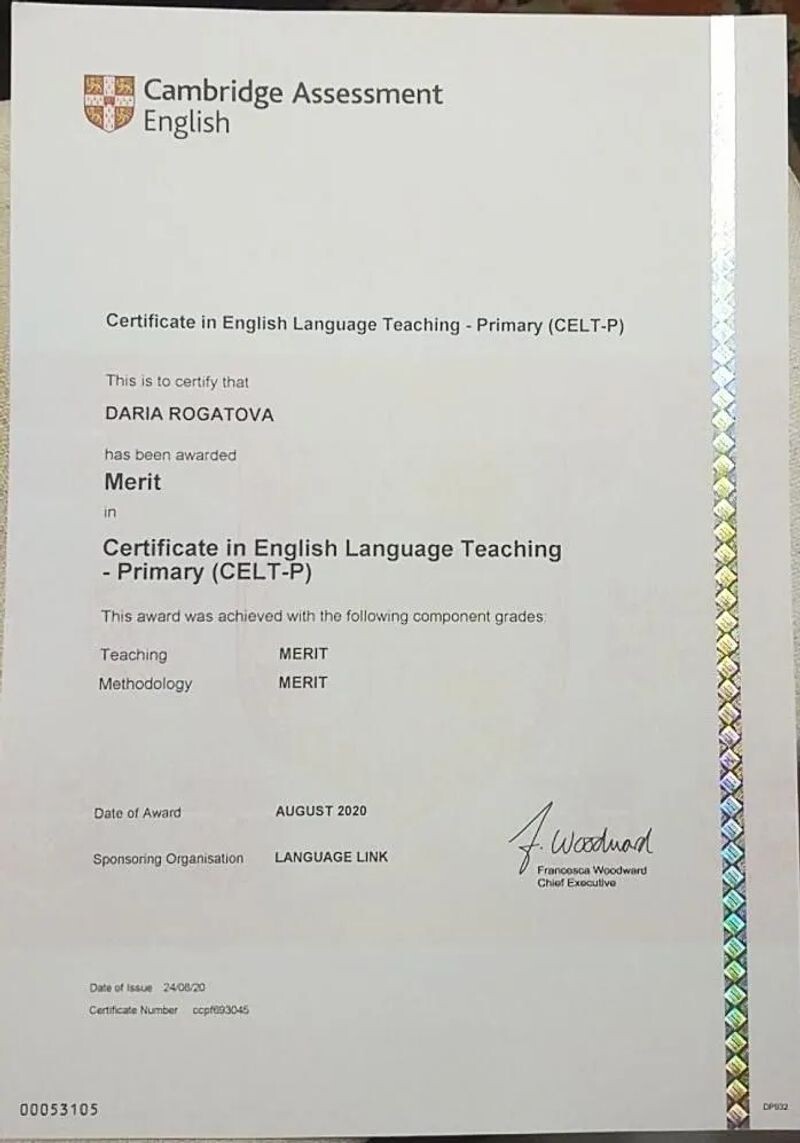 - Certificate in English Language Teaching – Primary (CELT-P), 2020 г.