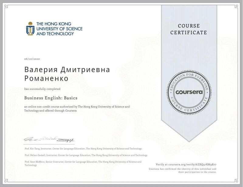 - Сертификат о прохождении курса по бизнес английскому, 2020 г.