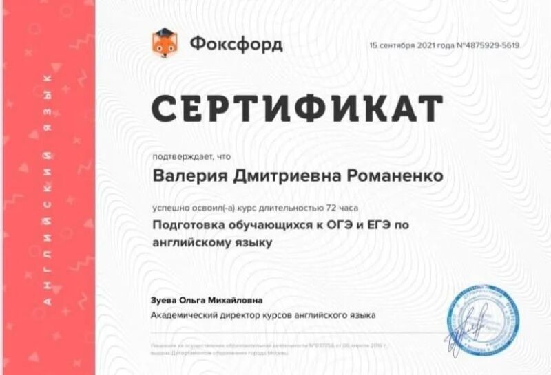 - Сертификат о прохождении курса по ЕГЭ и ОГЭ, 2021 г.