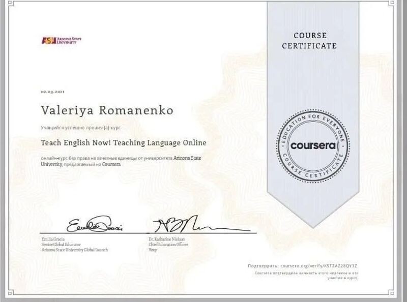 - Онлайн-курс по преподаванию английского языка (Coursera), 2021 г.
