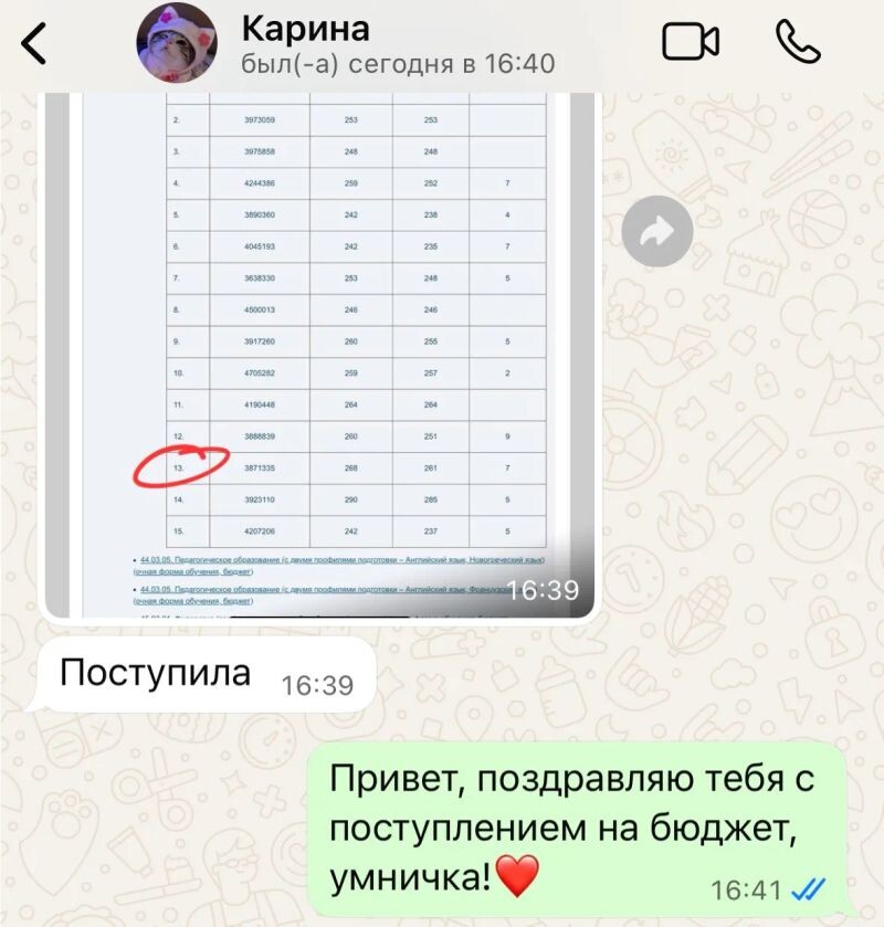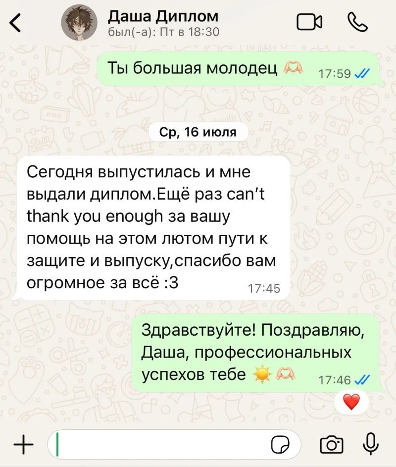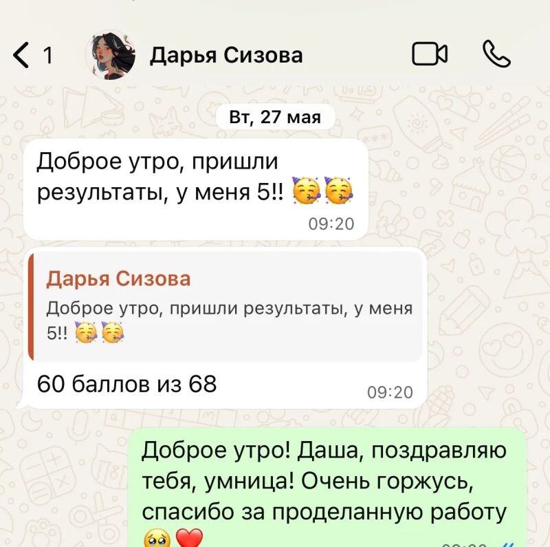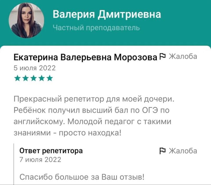 Я счастлива, что нашла Валерию Дмитриевну на этом сайте, она помогла мне подготовиться к егэ всего за полгода. Она предоставила мне множество необходимых материалов, которые я не смогла бы найти сама. Занятия были очень комфортными и даже веселыми. Спасибо большое ❤