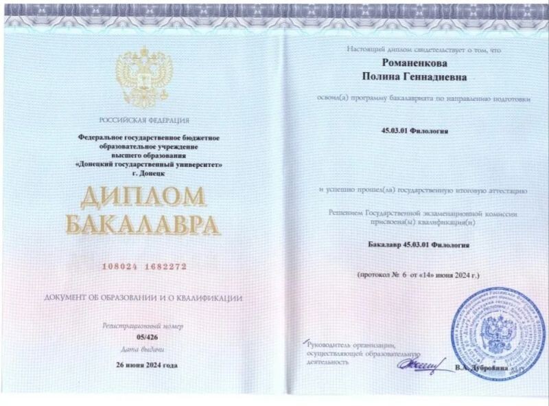 - Донецский государственный университет, филология, 2020–2024 гг.