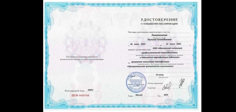 - Московский институт профессиональной переподготовки и повышения квалификации педагогов, программа «Функциональная грамотность школьников», 2023 г.