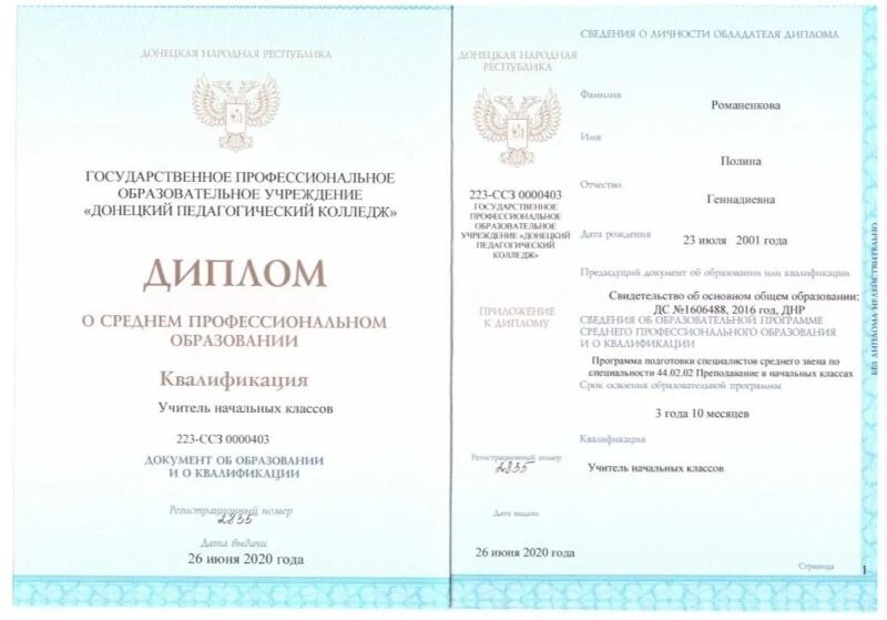 - Донецский педагогический колледж, преподавание в начальных классах, 2016–2020 гг.