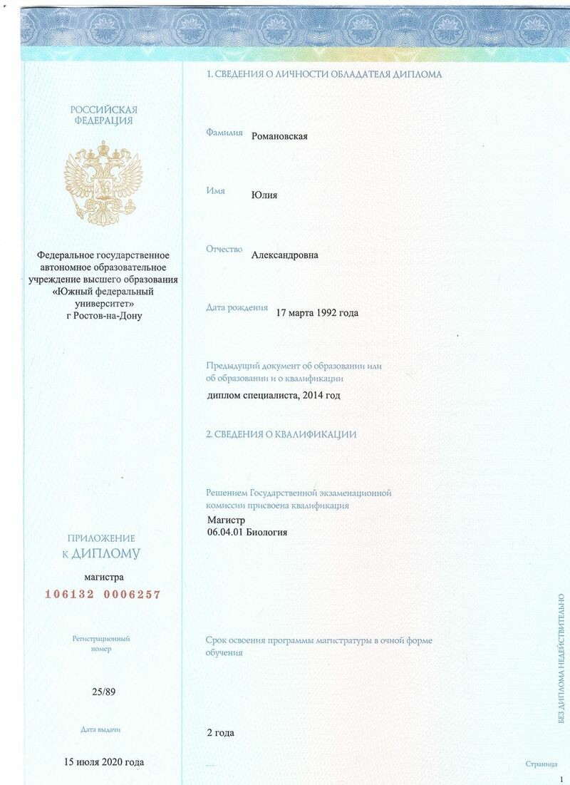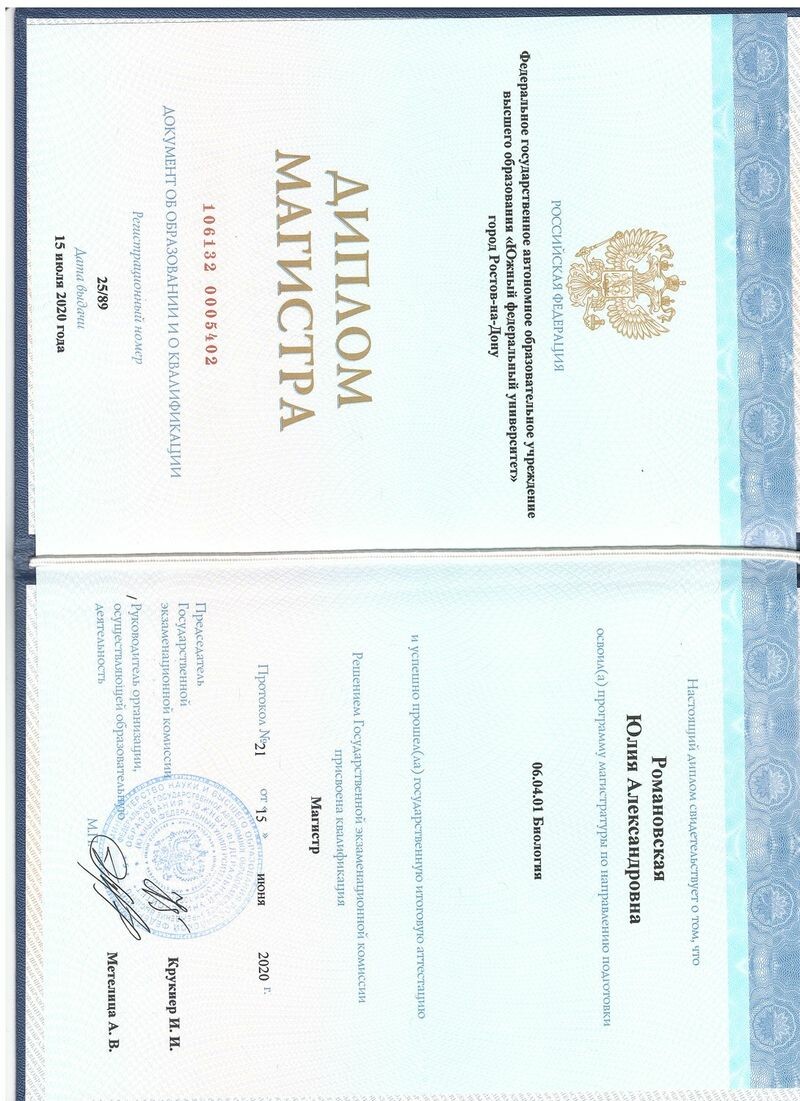 - ЮФУ, АБиБ, магистр биологии, 2018–2020 гг.
