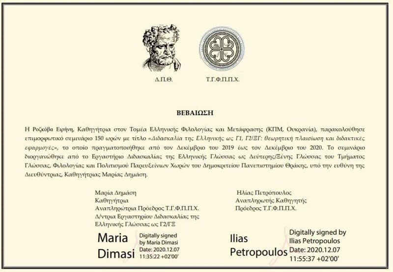 - Фракийский университет имени Демокрита, курсы повышения квалификации "Преподавание новогреческого как иностранного" (Греция), 2020–2021 гг.